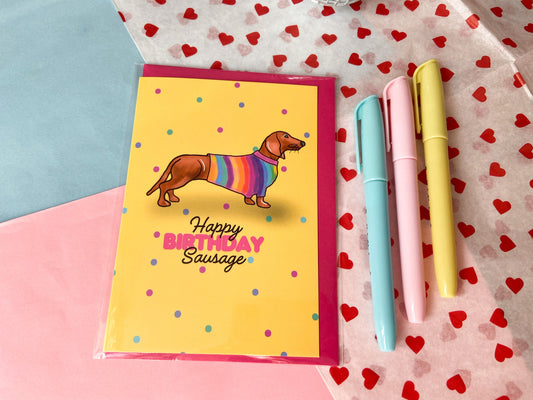 Happy Birthday Sausage Dog Card, Rainbow Dachshund