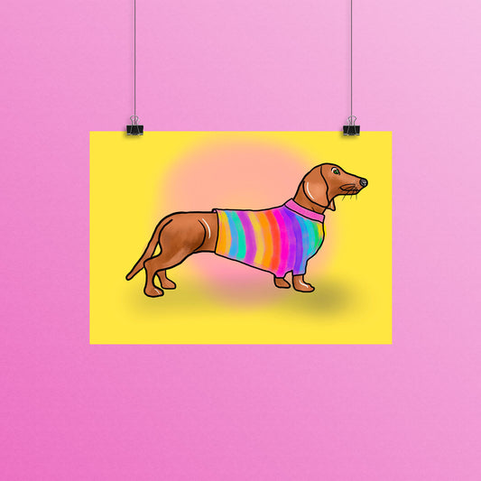 Dachshund in Rainbow Jumper A4 Print, Sausage Dog Art